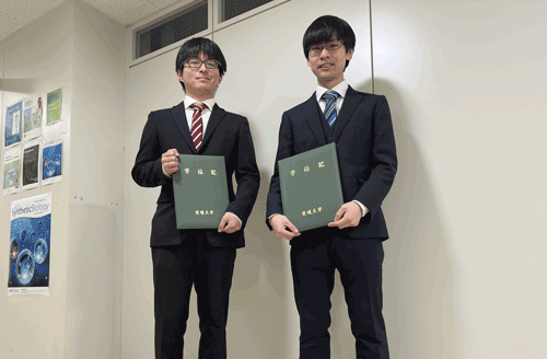 4回生の土居君と須崎さんが、学部課程を修了し、学士(工学)の学位を取得しました。 -