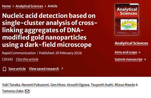 暗視野顕微鏡による金ナノ粒子凝集の一分子観察に基づく核酸検出についての論文「Nucleic acid detection based on single-cluster analysis of cross-linking aggregates of DNA-modified gold nanoparticles using a dark-field microscope」が Analytical Sciences 誌に受理されました。座古研(理学部)・朝日研(工学部)・理研との共同研究で、「先端ナノ・バイオ分析研究ユニット」などの成果です。