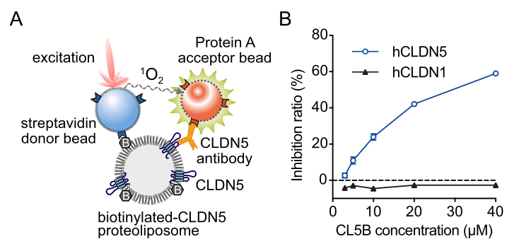 本研究で私たちは血液脳関門のバリアを形成するClaudin-5(CLDN5)の低分子阻害剤を探索しました。探索にあたり私達は、CLDN5に結合し、その立体構造を変化させる化合物の取得を目指すことにしました。CLDN5の立体構造の変化を評価するために、先行研究で取得した立体構造認識抗体と無細胞合成したCLDN5プロテオリポソームを用いたAlphaScreenアッセイ系を構築しました。9,600化合物を探索した結果、CLDN5に結合し、短時間だけバリアを緩める活性を持った化合物、CL5Bを取得することに成功しました。なお、CLDN5とCL5Bが直接的に結合することをSPRを用いて確認するのにも、無細胞合成したCLDN5ナノディスクを用いています。